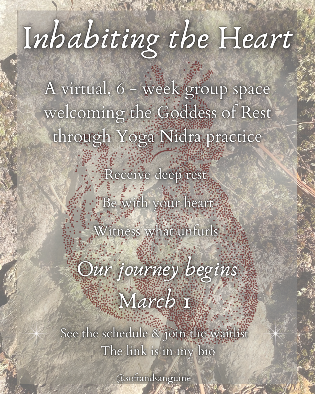 Every practice of Yoga Nidra will offer you something different. I see this as a space for the body to receive exquisite care and attention. This is an opportunity to create a nest for yourself, with guidance from me, rooted in the intention to practice offering love and complete comfort to the body. A portal connecting your body with deep rest.